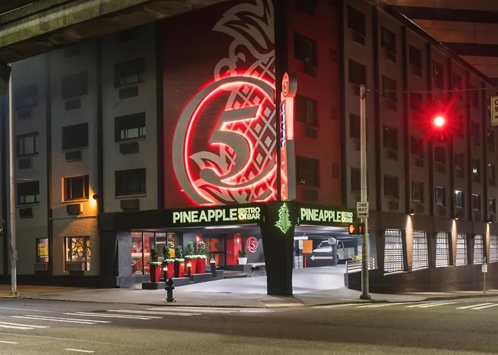 Staypineapple, Hotel Five, Downtown Seattle is an eco-friendly hotel featuring modern decor and rooms equipped with free Wi-Fi and colorful interiors. Guests can enjoy amenities such as complimentary bicycles for exploring the city. This hotel is conveniently located within walking distance to major attractions like the Seattle Center and Pike Place Market. Afternoon refreshments in the lobby round out a pleasant stay.